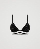 Triangle bikini top embroidered with hotfix rhinestones, sequins and beads. Removable padding, the straps can be self tied behind the neck or turned into shoulder straps using the eyelet ends; back self-tie.