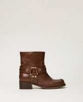 Leather ankle boots with square toe, gold-tone buckle and tunit sole.