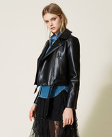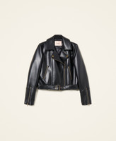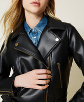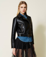 Double-breasted leather-like biker jacket with zip and adjustable belt at the waist, inner lining.