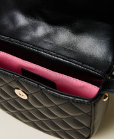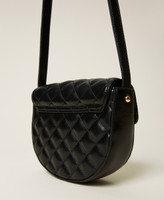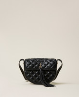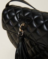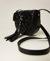 Nappa-like crescent shoulder bag with diamond quilting, flap and magnet, decorative tassel.