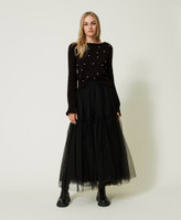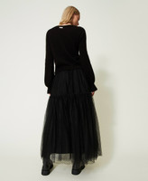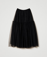 Long skirt with double tulle layers, flounce and ruffle, elasticated waist and inner lining.