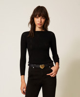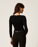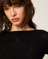 Stretch viscose blend jumper with a check pattern obtained by alternating rib knit and openwork stitches. Boat neckline, long sleeves, fitted.