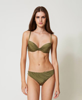 Push-up front twist bikini top with non-removable padding. Straps can be self tied behind the neck or turned into shoulder straps using the eyelet ends. Back self-tie.