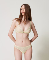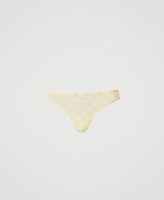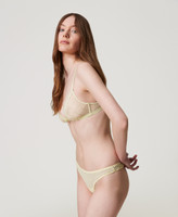Tulle g-string embroidered with Oval T pattern, elastic trims, heart-shaped metal logo plate with satin and lace bow at the back, tulle lining.