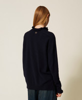 Wool and viscose blend jumper with small ruffles at the neck and cuffs. Plain knit, turtle neck, long sleeves, ribbed trims, side slits, Oval T logo plate at the back, loose fit.