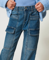 Girls’ cargo jeans made from medium blue super stretch denim, stone washed with contrasting stitches, belt loops, zip and stud button fastening, appliqué pockets with flaps, embossed logo at the back, straight fit.