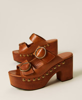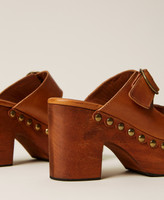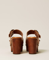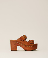 Leather sandals with nailed wooden platform, double band with buckle, rubber sole.