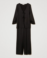 Mannish satin pyjamas with straight open jacket with V neck, tie fastening, three-quarter-length set-in sleeves with georgette ruffles at the hem, and wide leg trousers with elasticated waist and heart-shaped metal logo at the back.