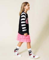 Experience the super soft feel of this Girls’ maxi jumper with slight boat neck, contrasting inlaid writing and striped sleeves. Perfect with ankle boots and flounced tulle skirt.
