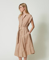 Midi shirt dress made from cotton poplin with animal print, wing sleeves, covered button closure, and matching belt.