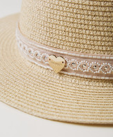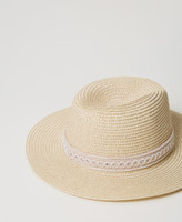 Raffia-like hat with grosgrain ribbon embroidered with beads, and inner adjustment with ribbon and drawstring.