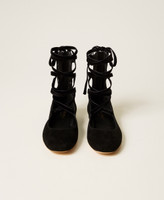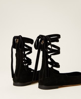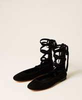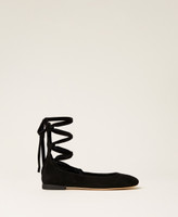 Suede ballet flats with removable ribbons that tie at the ankle and leather sole.