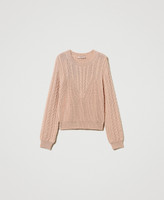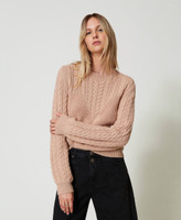 Wool blend cable and ribbed knit jumper made in Italy with round neck, long sleeves, loose fit.