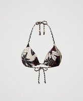 Reversible triangle bikini top with exotic flower print on one side and solid colour on the other, plaited shoulder straps with decorative tips.