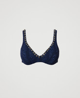 Triangle bikini top with embossed design, baguette and bezel embroidery, padded with non-removable cups, side stays and lining.