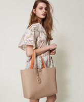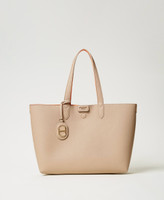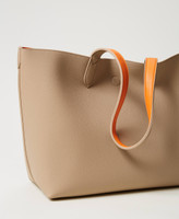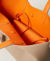 ‘Everywhere’ reversible shopper bag made from double two-tone faux natural grain calf leather with no lining. Double shoulder handle, magnet closure, lettering logo and removable charm with gold-toned metal Oval T. Contains a pochette with zip, logo and lining. Can be used as an inner bag, attached to the shopper with a karabiner, or as a separately bag.