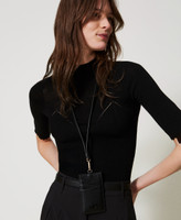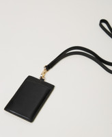Smooth faux calf leather card holder with asymmetric compartments, removable strap with karabiner and Oval T logo.
