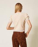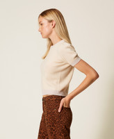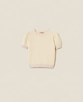 Cashmere blend jumper with lurex ribbed trims. Crew neck, short puff sleeves, logo on the back, loose fitting.
