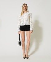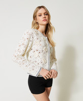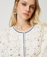 Cotton blend crochet jacket with contrasting trim and placed crochet flowers handmade embroidery, straight fit.