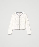 A precious and romantic style, this cotton blend crochet jacket features contrasting trim and hand-embroidered sewn crochet flowers in front. Straight fit, round neck, long sleeves with slight gathering, hidden snap button closure, Oval T logo plate on the back. A see-through item for your elegant dresses and sets.