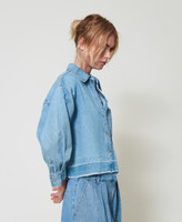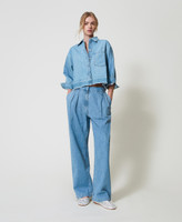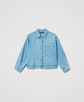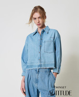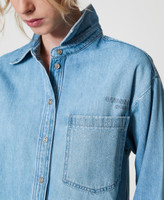 Actitude collection shirt made from fluid denim fabric with thread embroidered logo and small studs on the pocket. Classic collar, metal button fastening, long sleeves with inverted pleats at the cuffs, fringed hem with contrasting wash, loose fit.