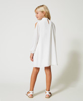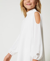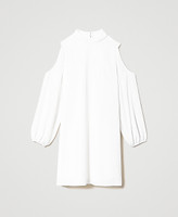 Short flared dress made from double georgette with cutout on the shoulder, collar band, teardrop opening with button on the back.