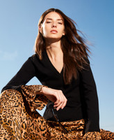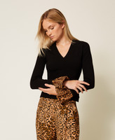 Stretch viscose plain knit jumper with viscose animal print insert at the cuffs. V-neck, long sleeves, Oval T logo plate on the back, fitted.
