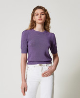 Cotton-blend jumper in plain knit with ribbed edges. Featuring a round neck, short sleeves gathered at the shoulders for fullness, Oval T logo tab on the back and a loose fit.