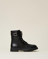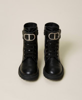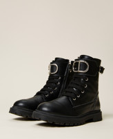Leather lace-up combat boots with strap and buckle, Oval T logo with rhinestones, rubber sole.