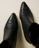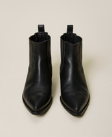 Leather ankle cow boots with tapered toe, side elastic gores and leather sole.