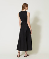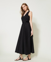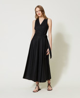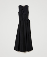 Long wrap-around dress made from stretch cotton poplin, with criss-crossed V neck, sewn belt on the side, sleeveless.