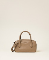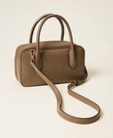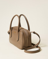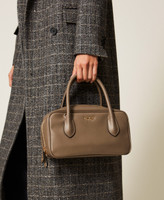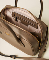 Medium bowler bag made from smooth faux natural calf nappa leather. Double zip closure with eyelets on pullers to attach charms, double tubular handle that can be worn over the shoulder, adjustable and removable shoulder strap for cross-body wear, metal lettering logo. Can be worn open on the sides, tote style. Lining and internal pockets.