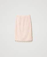 Midi skirt made from light fabric with floating feather-like threads, side zip, rear slit and inner lining.