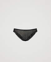 Irresistible charm for these see-through plumetis tulle Brazilian briefs with gathering and ruffled trim, picot elastic at the waist, central seam and bow with little pearls on the back. Wear them with their matching push-up bra for an unrivalled lingerie set.