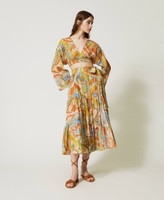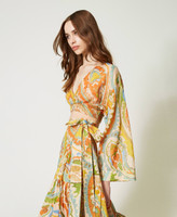 A revisitation of the paisley print in the colour of spices: it’s the Twinset-exclusive print starring on the cropped top made from Italian cotton muslin. V neck with drawstring on the back, long flared kimono sleeves, loose fit held by a fabric-covered elastic, Oval T logo plate. Perfect complement to many looks, also with the matching skirt.