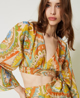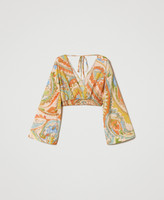 Cotton muslin cropped top with paisley print, V neck with drawstring on the back, long kimono sleeves, elasticated bottom.