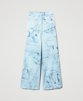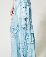 Actitude collection cargo trousers made hammered satin with denim-like print, side pockets and ribbons with metal tips.