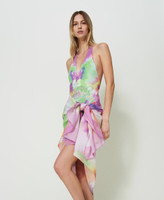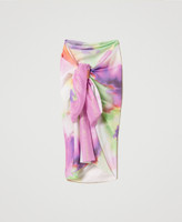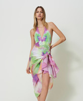 Cotton sarong with collection print, contrasting logo and colour band.