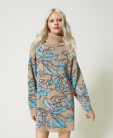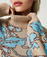 Maxi jumper made in Italy from the Treeblend yarn, in collaboration with Marco Rambaldi. Four-tone pique jacquard work with vine leaf pattern and placed “Innesto d’amore” writing. Loose fitting, with turtleneck, ribbed hem, inner label with jacquard logo and contrasting two-tone lettering logo. The Treeblend project aims to lower CO2 emissions, with an expected 20% reduction relative to traditional knitwear production. The yarn contains 50% of recycled materials (PA and 50% wool), and the viscose it contains is parly derived from production waste material from Twinset's weaving processes. Materials are washed without any chemical solvants to reduce water consumption. Packaging is fully recycled.