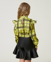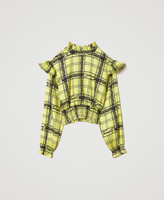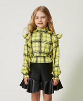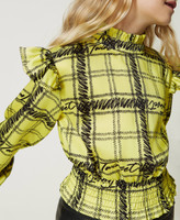 Twill blouse with check print and inset logo lettering, long sleeves with wing, band collar, no lining.