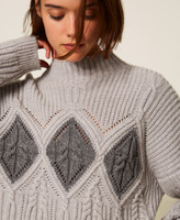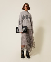 Wool blend intarsia knit jumper with cable knit and contrasting colour diamonds patters with lurex. Crater neck, long sleeves, front hem and sleeves with cable and rib knit patterns, Oval T logo plate on the back, wide fit.