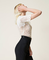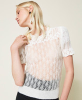 Wool blend openwork jumper with scalloped neckline, short sleeves with double lace flounce.