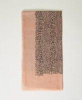 Fabric kefiah with animal print and lurex thread at the bottom, frayed hem, contrasting lettering logo.