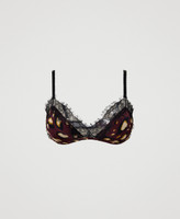 Padded triangle bra made from animal print satin, with removable cups, and scalloped lace trim.