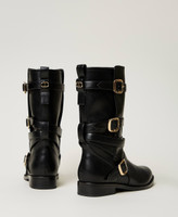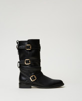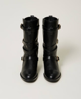 Biker boots with buckle straps, chunky heel, rubber sole.