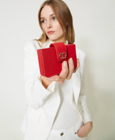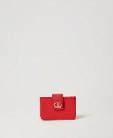 Leather-like saffiano print card holder with side bellows, strap and snap button closure, metal Oval T logo.