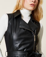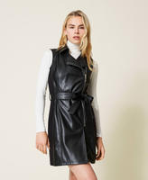 Coated fabric sleeveless dress with Milano stitch inserts, collar, zip closure.