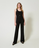 Milano stitch sleeveless jumpsuit made from stretch viscose blend with waist strap with metal Oval T. Deep round neck, vertical seams enhancing the silhouette, back zip fastening, fitted with flared leg.