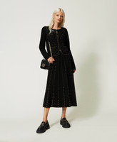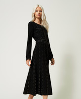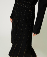 Stretch viscose A-line midi skirt with a tubular construction that mimics pleats and fadeout stud appliqués.