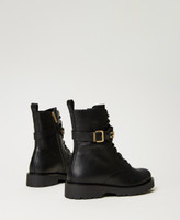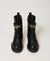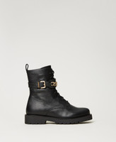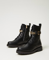Leather combat boots with galvanized gold-tone Oval T chain on the central flap, inner zip, rubber sole.